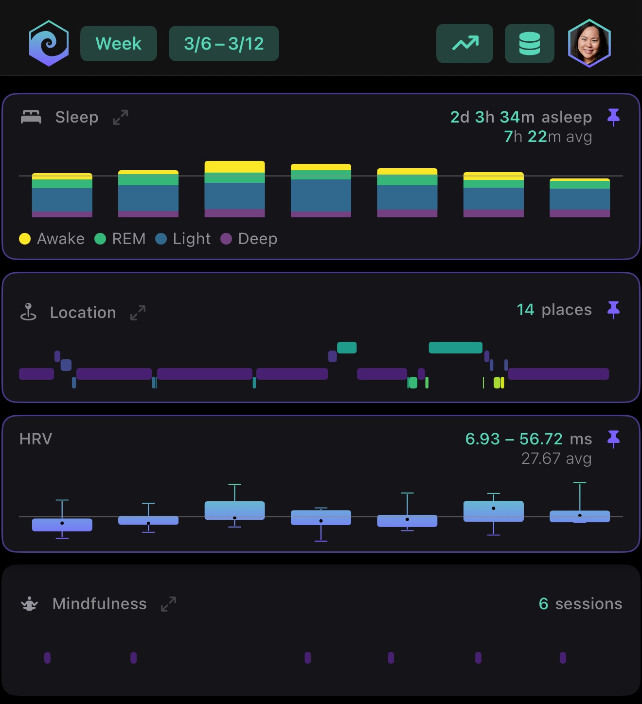 HRV/rHR trends, sleep regularity, evening screen time, weekend spillover.